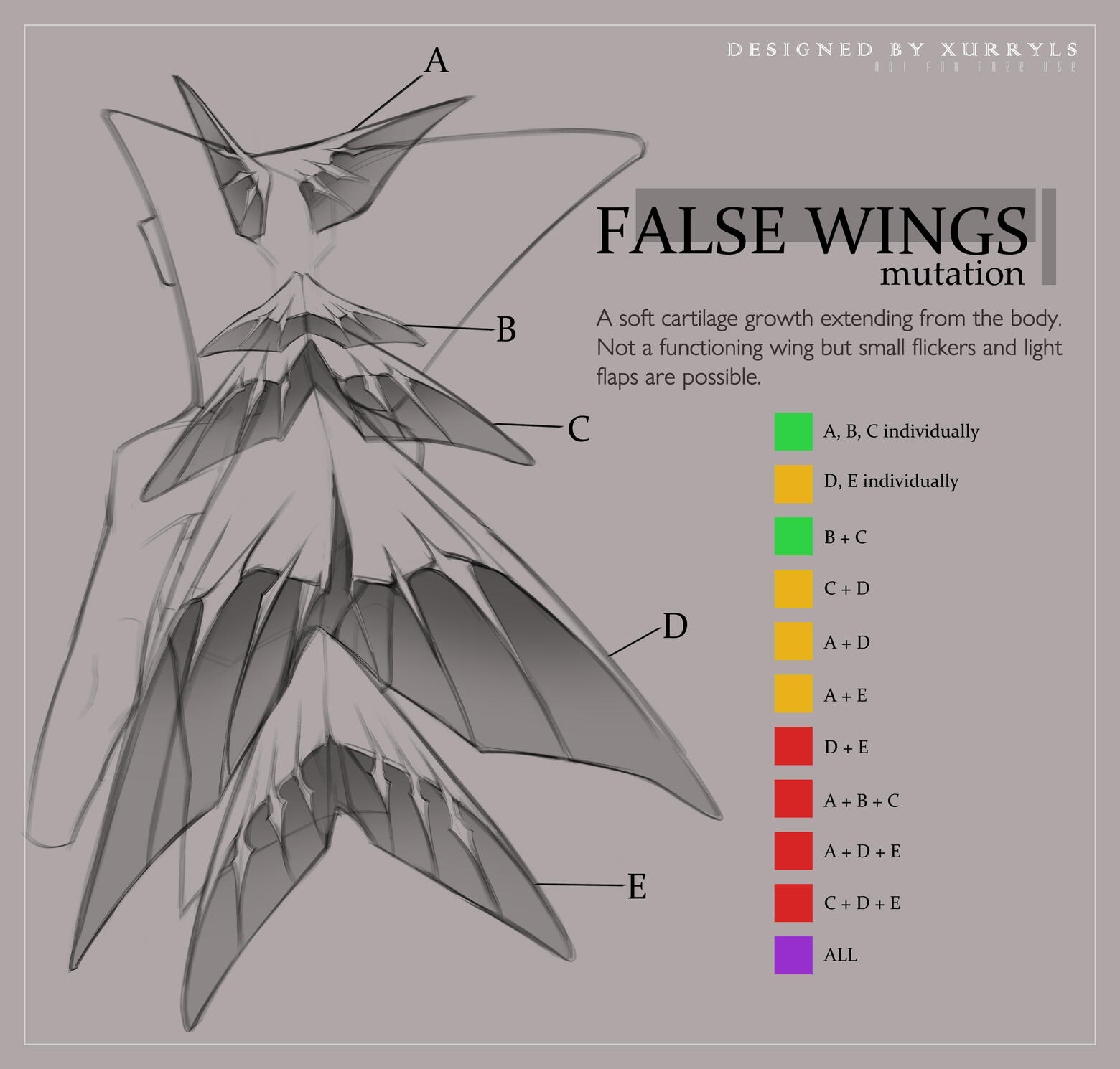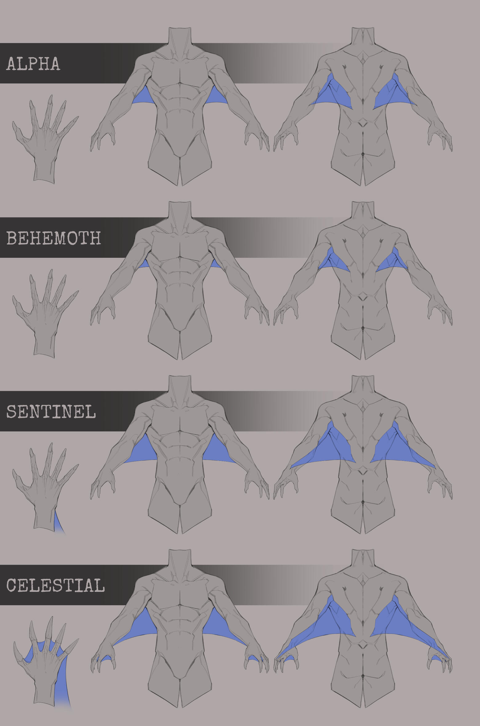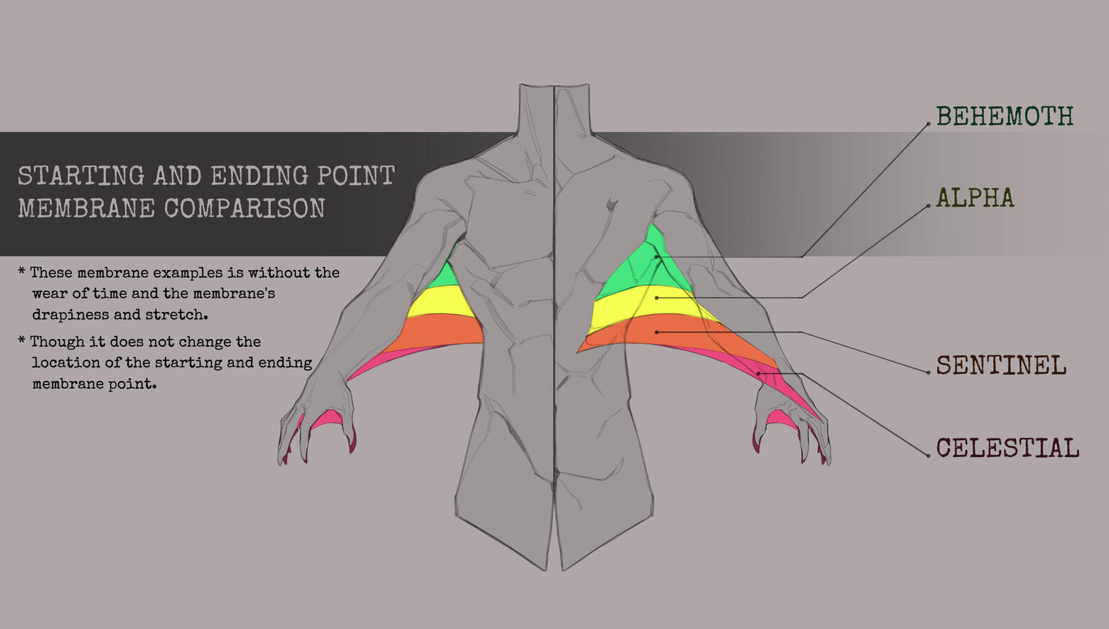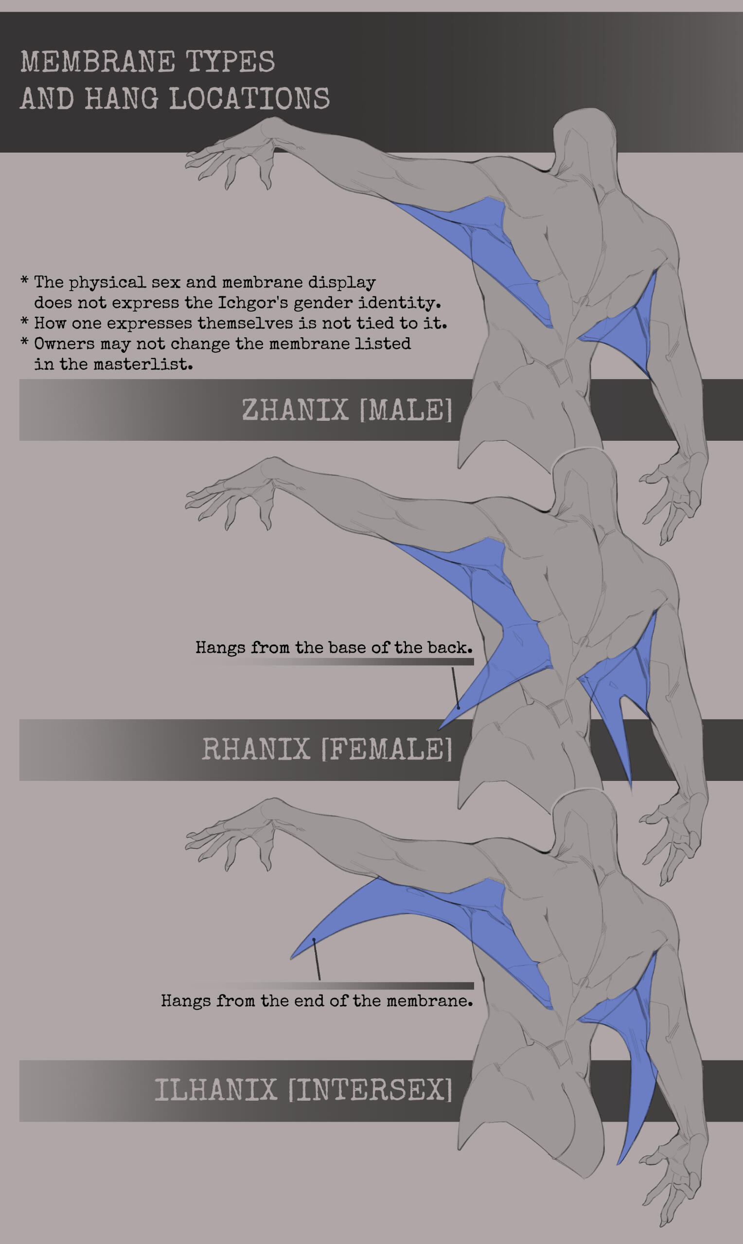 Be mindful that the length of an Ichgor’s membrane is greatly affected by what class they are. Behemoths are known for having the shortest membrane, located underneath their armpits, while the Celestials have the longest one, starting from their wrist to their lower spine, as they share the most traits from their Wyvern ages.There is 3 membrane types to take note of.