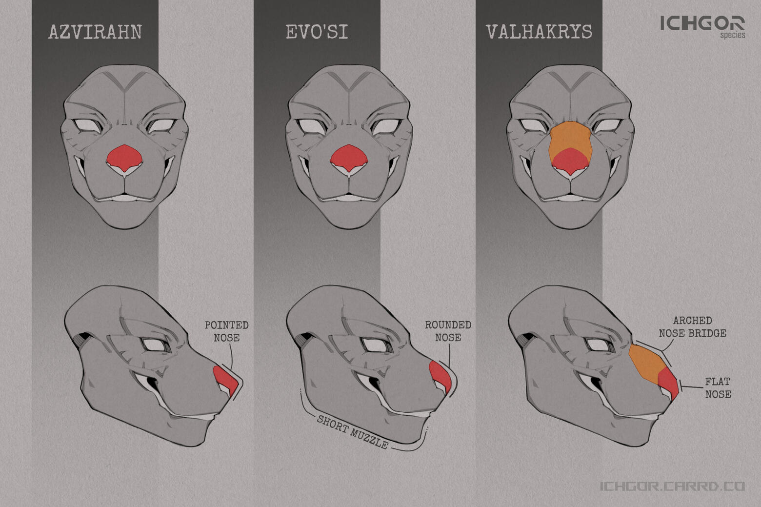 Ichgor have a significant difference in their facial structure, which tells them apart depending on the subspecies. This unique difference evolved due to the region from which they originated. Their distinction varies and can be identified by the shape of their noses and the structure of their teeth.