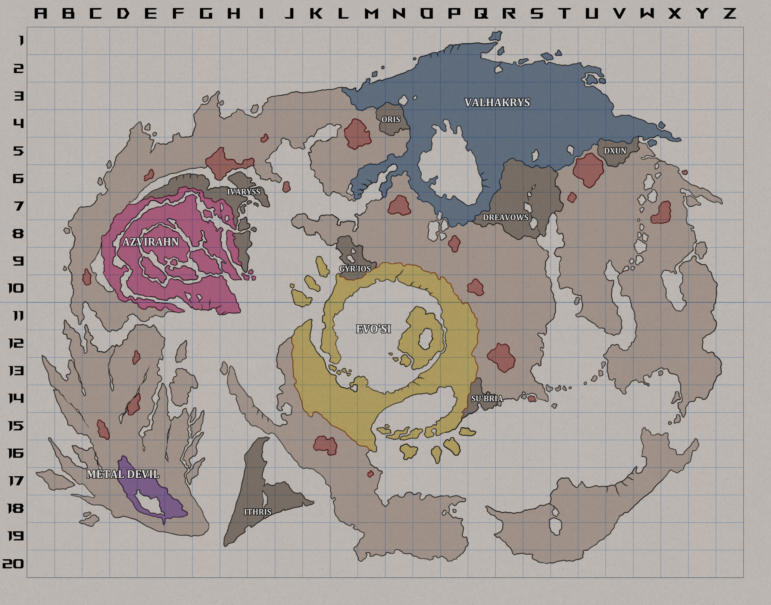 Living in a region covered in ice more than not may be a challenge for some, but the Valhakrys are perfect for the job. Environments in Valhakrys can range from a cold swamp to the subzero ruins of a giant beast. One thing is true: Most Ichgor need to pack layers to travel in this region.Farming and cattle is heavily restricted to lower areas these animals can survive in. The rest is a mountainous tundra filled to the brim with frozen secrets and beasts that will go after anything that can provide them a good meal. Fire is an important resource for these Ichgor to stay warm, with safe spots in travelled areas to shelter weary travelers for the night.Resources for the Valhakrys heavily rely on the beasts they hunt and the bones and pelts they procure. Clothing is artfully made to survive the cold winter nights and are given down generations. Foods like fruits and vegetables are scarce and a luxury only the ones with wealth may have, with common folk resorting to a diet of dried seeds, nuts and meat.